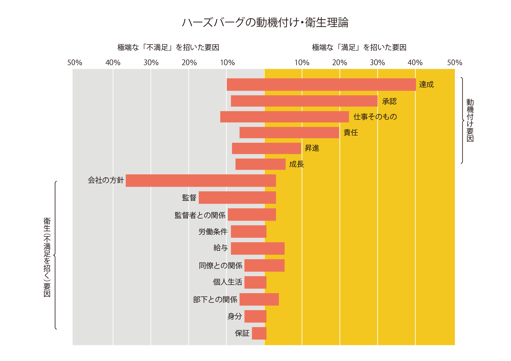 衛生要因が人間の環境に関するものであり、仕事の不満を予防する働きを持つ要因であるのに対して、動機付け要因はより高い業績へと人々を動機づける要因として作用しています。