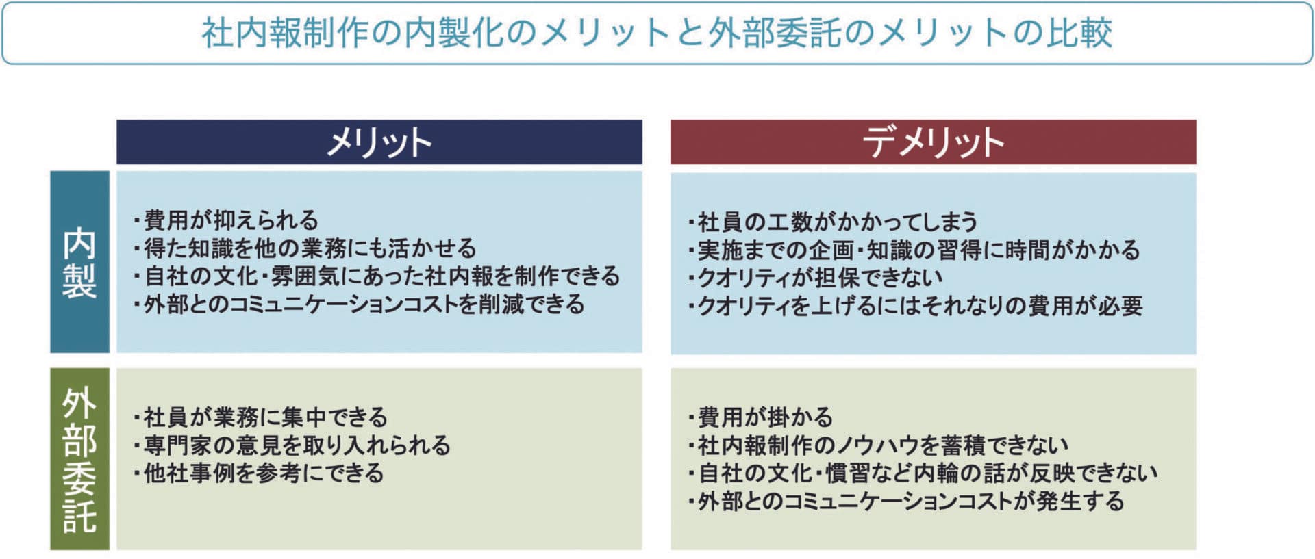 社内報を内製化した場合と外部委託した場合のメリット・デメリットは上記の表の通りです。内輪の話題を中心に構成し、社内の団結力を強めたい場合は内製された方が良いかもしれません。部署間を横断するような意識統一(理念の浸透など)を重視したい場合は、部署間を越える権限を持たせるなどした“広報部”のような部署を創設する方が良いかもしれません。