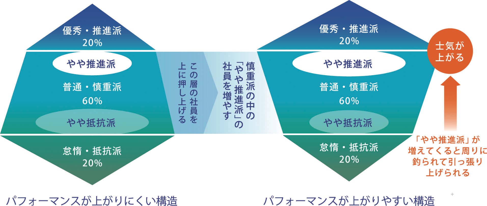 この機能を活用することで、下記の図のように、組織の中で士気のレベルの違いにより2:6:2の層に分かれている真ん中の6割の中層(“日和見”で状況によっては、上層・下層のどちらに着くか静観している普通レベルの社員の士気)を、優秀・推進派に近づけるように働きかけていきます。