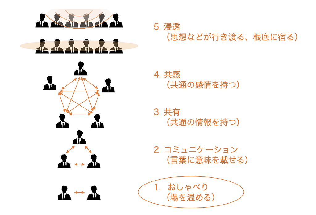 この段階は、コミュニケーションの最初の一歩であり、社員同士がリラックスした雰囲気の中で交流し、関係を築くための重要なフェーズです。「おしゃべり」は単なる雑談ではなく、社員が互いに安心感や信頼感を抱く基盤を作るためのものであり、これが無ければその後の深いコミュニケーションは成立しません。特に、新入社員や異なる部署間の交流においては、おしゃべりが果たす役割は非常に大きいなものになります。