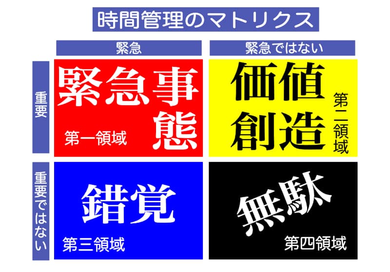 - 第4領域:緊急でも重要でもないこと(時間の浪費に当たること、例えば過度な娯楽など)